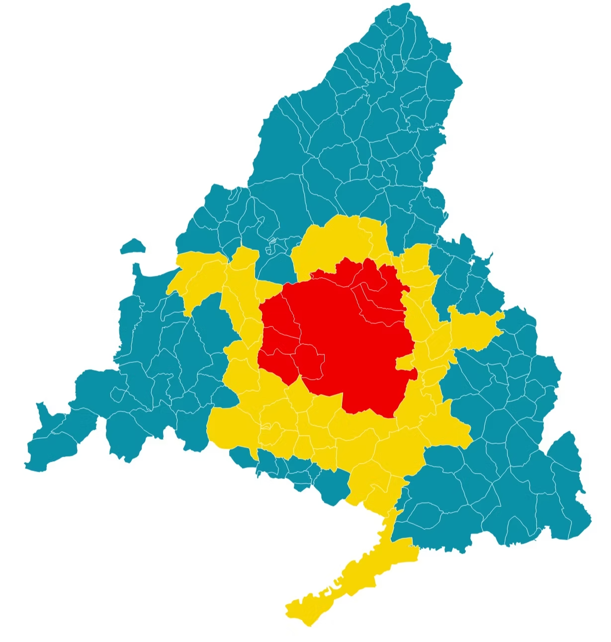 Ajalvir, Alcalá de Henares, Alcorcón, Algete, Aranjuez, Arganda del Rey, Arroyomolinos, Brunete, Ciempozuelos, Cobeña, Collado Villalba, Colmenarejo, Colmenar Viejo, Coslada, El Escorial, Fuenlabrada, Fuente el Saz de Jarama, Galapagar, Getafe, Humanes de Madrid, Leganés, Mejorada del Campo, Moraleja de En medio, Móstoles, Navalcarnero, Paracuellos de Jarama, Parla, Pinto, Rivas-Vaciamadrid, San Agustín de Guadalix, San Fernando de Henares, San Lorenzo de El Escorial, San Martín de la Vega, Torrejón de Ardoz, Torrelodones, Valdemoro, Velilla de San Antonio, Villanueva de la Cañada, Villanueva del Pardillo y Villaviciosa de Odón.